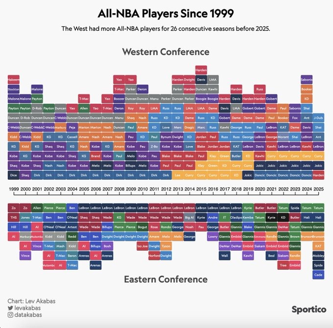 東部8人入選最佳陣容超過(guò)西部!1997-98賽季后首次