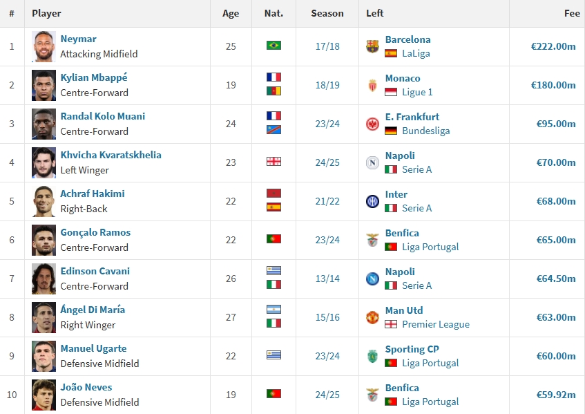 巴黎隊史前十引援