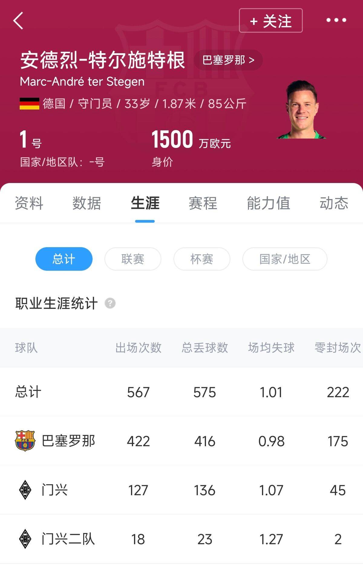 目前特爾施特根已經(jīng)33歲,這位德國國門(mén)在2014年加盟巴薩,效力球隊至今出戰422場(chǎng),丟球數416粒,實(shí)現175場(chǎng)零封?,F身價(jià)1500萬(wàn)歐的特爾施特根,未來(lái)何去何從呢?