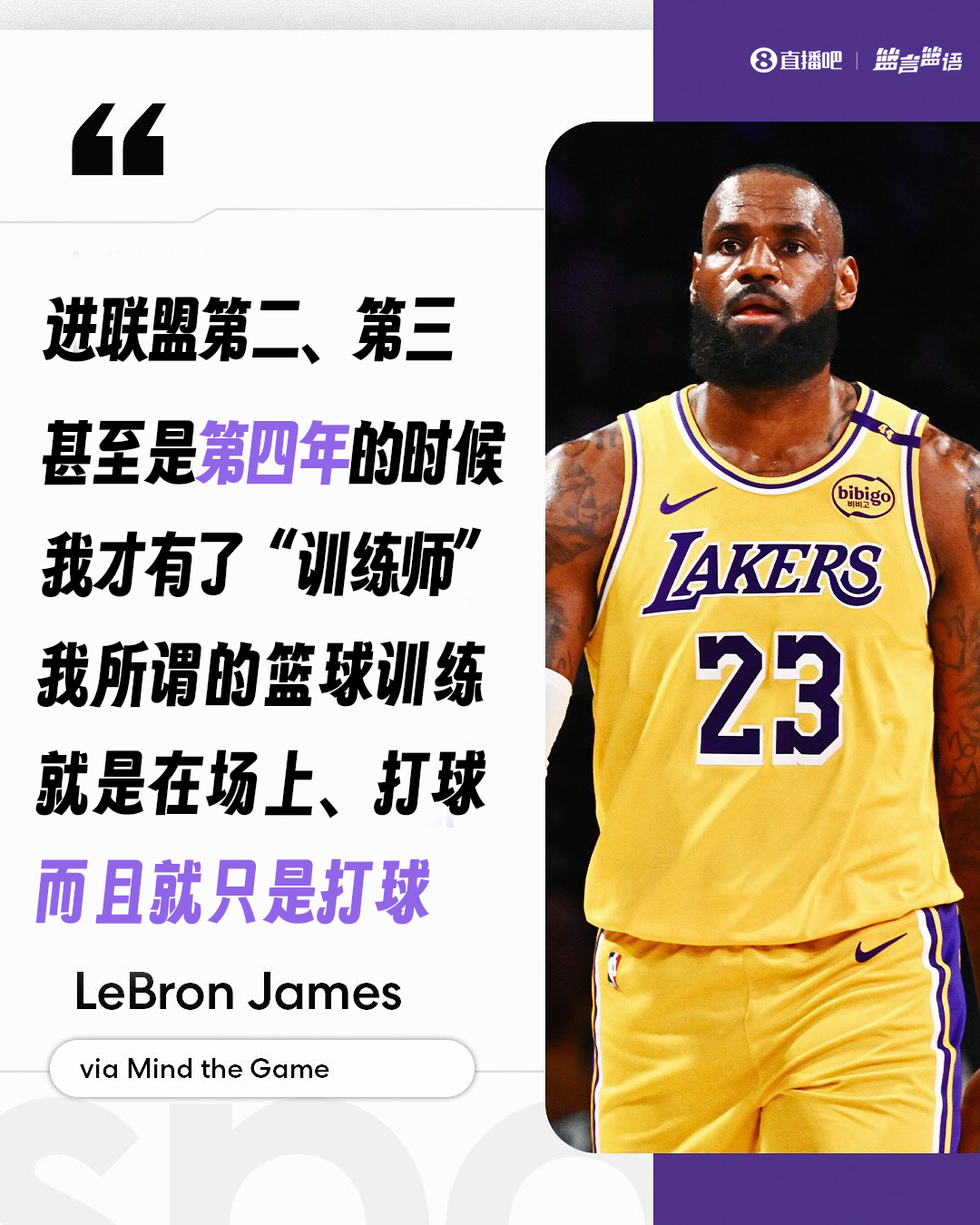 詹姆斯說(shuō):“我一直沒(méi)有‘籃球訓練師’,直到我進(jìn)NBA的第二、三,甚至是第四年,我才有了‘籃球訓練師’。我所謂的籃球訓練就是在場(chǎng)上打球,而且就只是打球。五對五,二對二,或者三對三,還有我們小時(shí)候玩過(guò)的33分或者21分比賽。