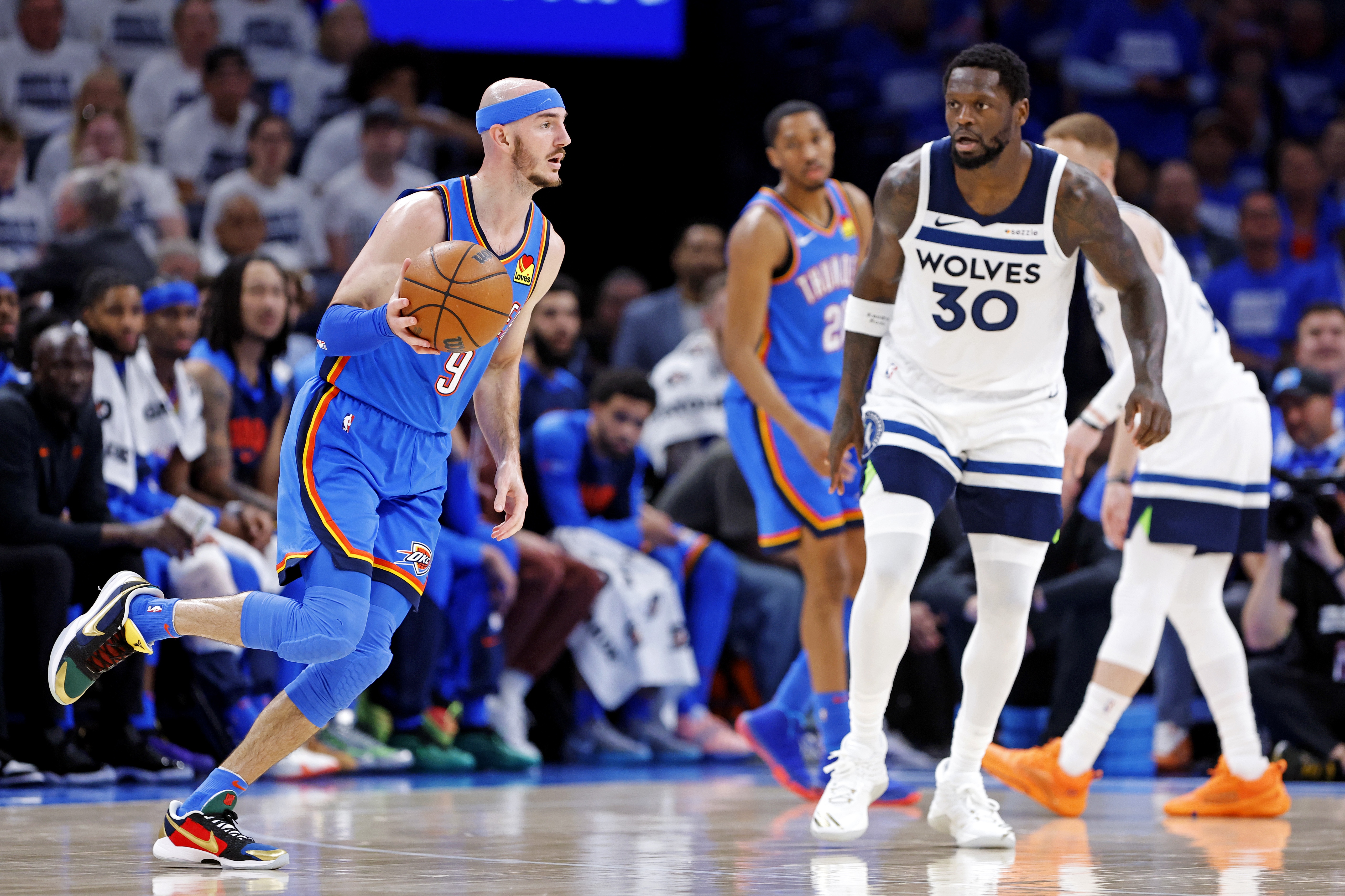雷霆的五外陣容強在卡魯索和華萊士能從一頂到五,團隊防守能力遠在森林狼之上,卡魯索上半場(chǎng)3次搶斷無(wú)處不在,雷霆小陣容的防守壓迫能力直接把森林狼里德和蘭德?tīng)杻蓚€(gè)空間型內線(xiàn)嚇到不敢處理球——森林狼半場(chǎng)14次失誤,其中被雷霆搶斷9次,神仙難救。