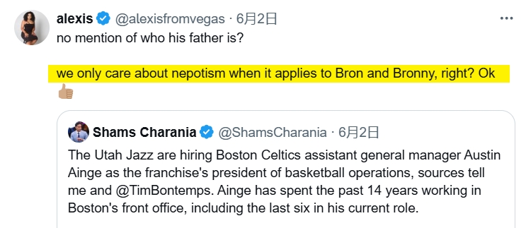 媒體人Alexis就批評Shams說(shuō):“不提他的爸爸是誰(shuí)?所以我們只在勒布朗和布朗尼身上才談?wù)摗箮шP(guān)系’是嗎?OK??”
