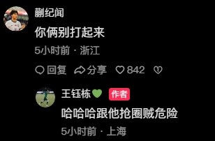 看見(jiàn)王鈺棟與劉誠宇同框的照片,蒯紀聞留言寫(xiě)道:“你倆別打起來(lái)?!蓖踱晽潉t回復“哈哈哈跟他搶圈賊危險?!?/p>