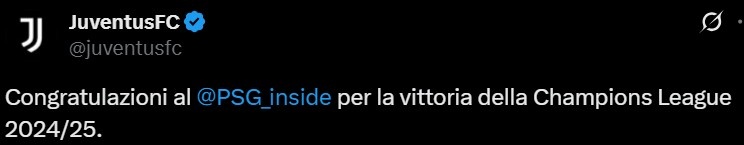 尤文圖斯官推也發(fā)文向巴黎表示祝賀,寫(xiě)道:“祝賀巴黎奪得24/25賽季歐冠冠軍!”