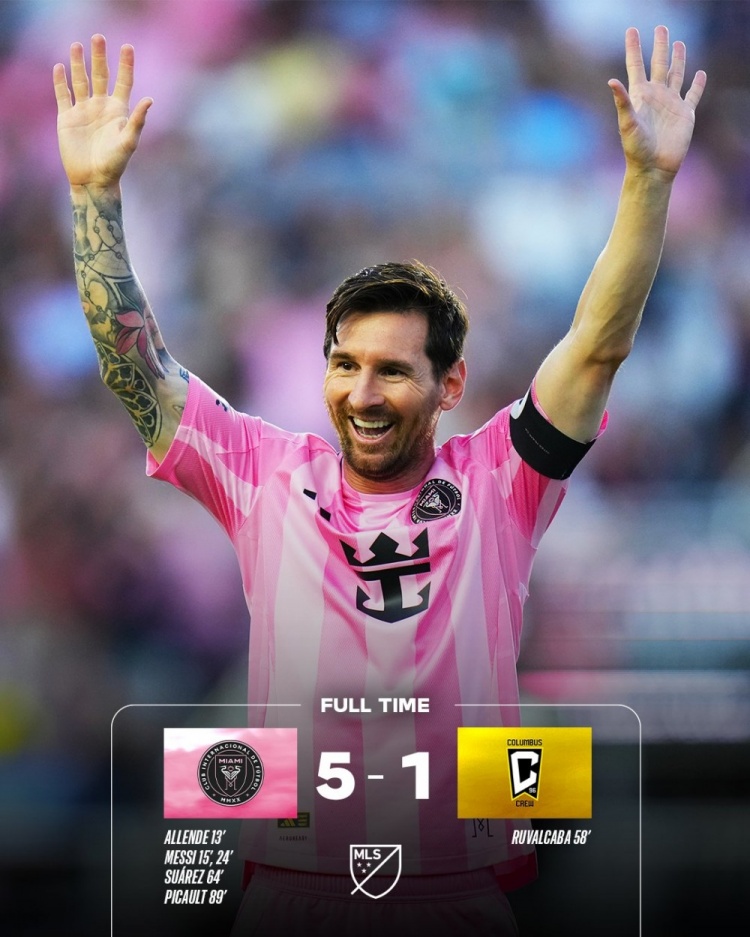 6月1日訊 北京時(shí)間6月1日07:30,美職聯(lián)常規賽邁阿密?chē)H迎戰哥倫布機員的比賽在大通體育場(chǎng)進(jìn)行,上半場(chǎng)梅西2射1傳,阿連德單刀破門(mén),布斯克茨獻助攻,半場(chǎng)結束,邁阿密?chē)H3-0哥倫布機員。下半場(chǎng)塞薩爾頭球扳回一城,蘇亞雷斯推射建功,梅西助攻法法推射破門(mén),最終邁阿密?chē)H5-1哥倫布機員取兩連勝距榜首4分。