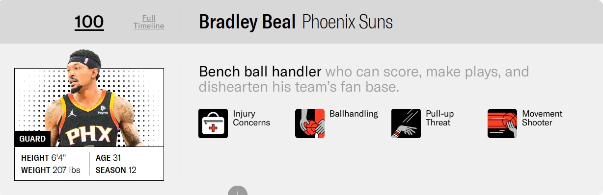 06月05日訊 The Ringer今日依據球員一整個(gè)常規賽+季后賽的表現,對24-25賽季進(jìn)行了百大球員的排名,其中100-51部分球員排名如下。