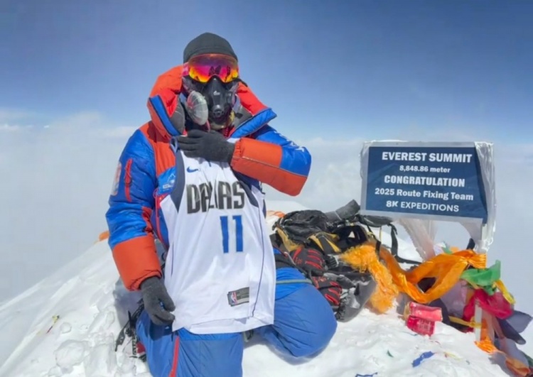 6月1日訊 獨行俠球星歐文在社媒上回應了一位球迷,該球迷身穿自己的獨行俠隊球衣登頂珠峰。