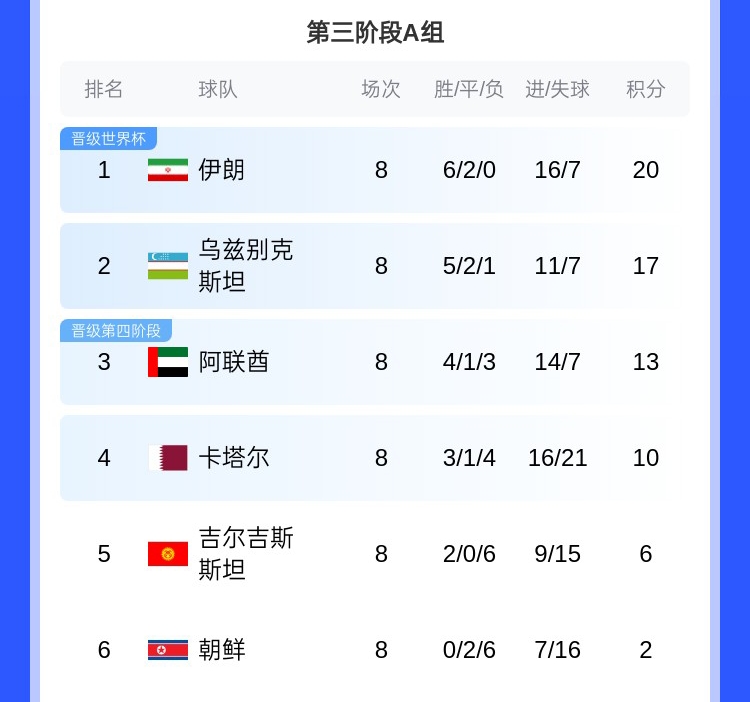 A組伊朗在階段保持不敗,上輪已提前鎖定直通名額,而排名第2的烏茲別克斯坦領(lǐng)先身后的阿聯(lián)酋4分,本輪兩隊直接較量,烏茲別克斯坦不敗即可鎖定直通世界杯的名額,如果晉級將是他們隊史首次參加世界杯正賽。