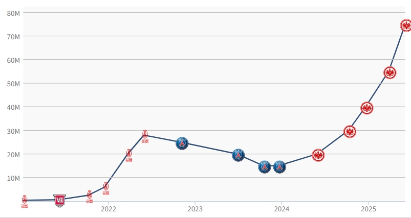 06月05日訊 德轉今日更新德甲球員身價(jià),法蘭克福前鋒?;倏松韮r(jià)上漲2000萬(wàn),達到7500萬(wàn)歐元。