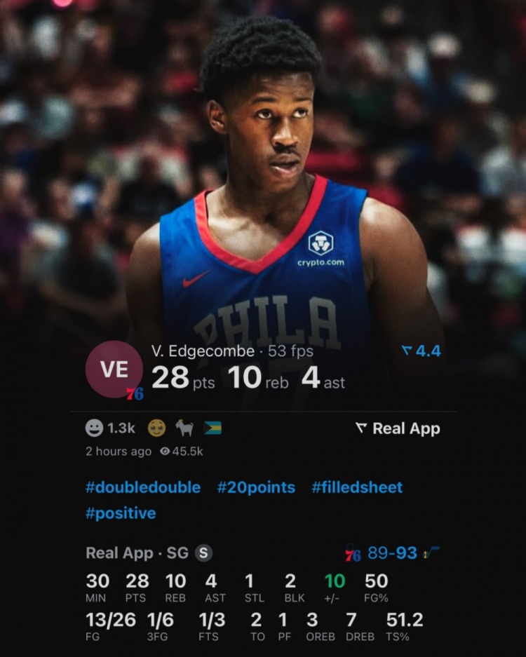 本場(chǎng)比賽,76人探花秀埃奇庫姆表現出色,得分和籃板都是全場(chǎng)最高拿到兩雙,不過(guò)最后時(shí)刻的高難度絕平三分不中,在30分鐘的時(shí)間里,投籃26中13,三分球6中1,罰球3中1,轟下28分10籃板4助攻1搶斷2蓋帽的數據,正負值+10。