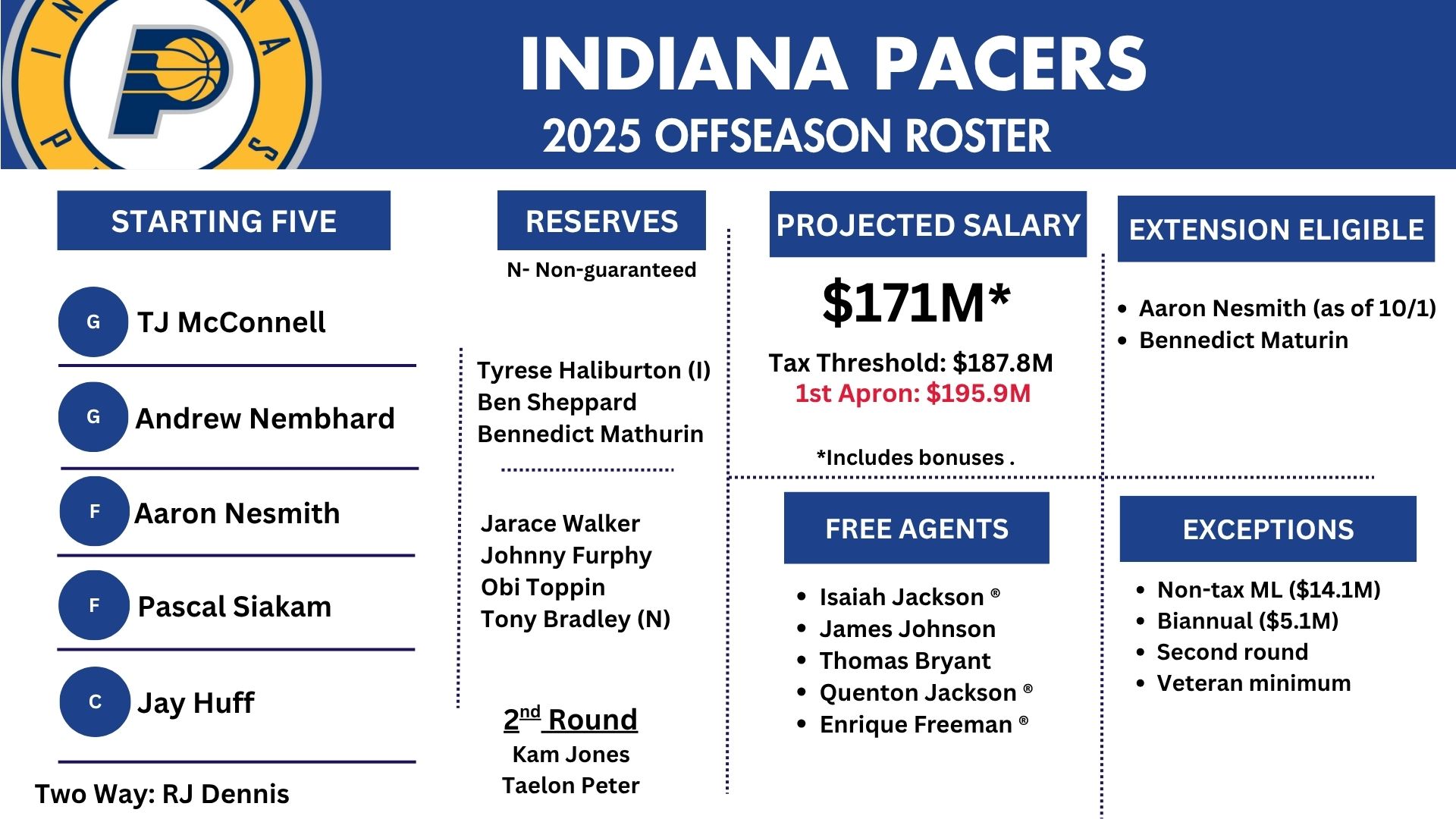 但不用慌,步行者目前總薪資僅1.71億美元,根本夠不著(zhù)奢侈稅線(xiàn)(1.878億),兩者差了1680萬(wàn)。