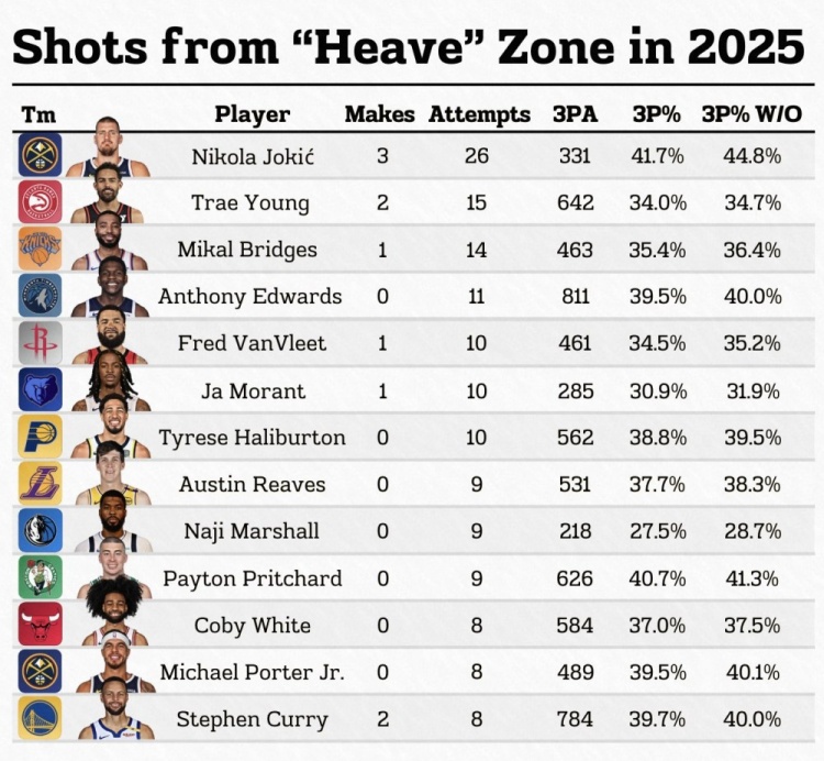 這條規則現在在夏季聯(lián)賽試行,未來(lái)可能會(huì )在NBA應用,對于提升比賽的精彩程度來(lái)說(shuō)是有利的,對那些在比賽中承擔超遠壓哨投籃任務(wù)的球員來(lái)說(shuō)也是好事。今天,老震為大家盤(pán)點(diǎn)一波上賽季出手這種投籃(heaves出手)最多的一些球員,看看刨掉這些出手,他們的三分命中率會(huì )提升多少。