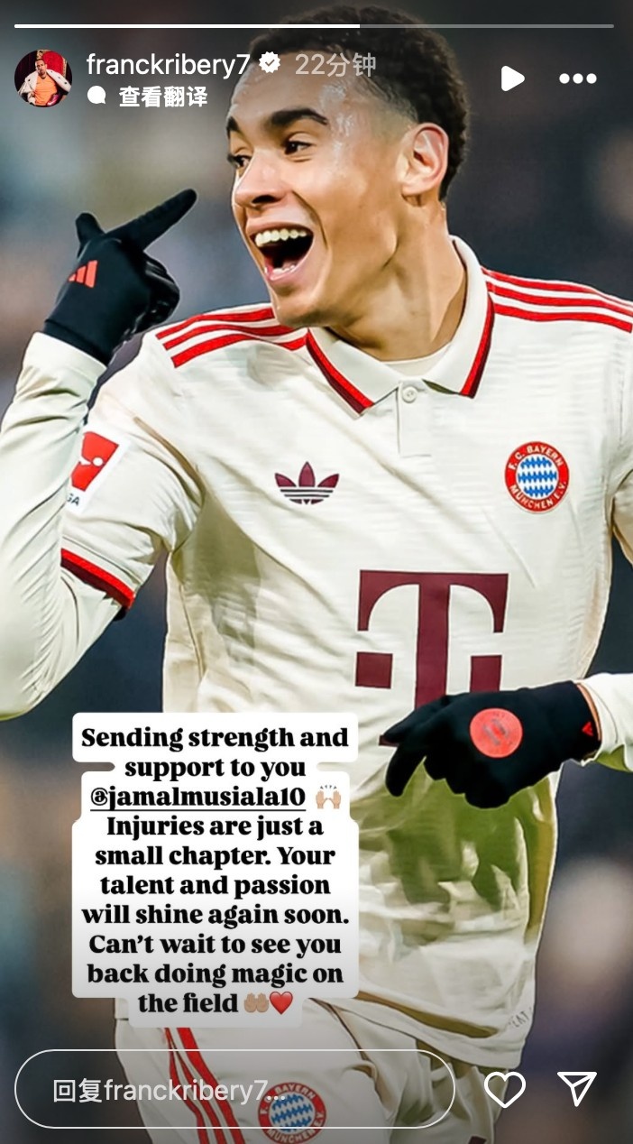 里貝里寫(xiě)道:向你致以力量和支持?jamalmusiala10,傷病只是個(gè)小插曲,你的才華和熱情很快就會(huì )再次閃耀。