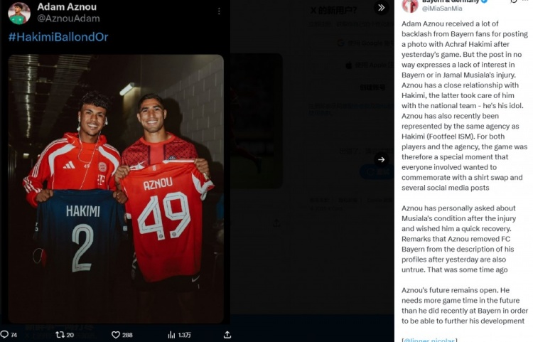 阿茲努和阿什拉夫均來(lái)自摩洛哥,兩人是國家隊隊友,后者不僅是拜仁小將的偶像,在國家隊也很照顧他。最近,阿茲努和阿什拉夫還簽約同一家經(jīng)紀公司Footfeel ISM。因此,對于兩位球員和經(jīng)紀公司來(lái)說(shuō),這場(chǎng)比賽創(chuàng )造了一個(gè)特別的時(shí)刻,大家都希望通過(guò)交換球衣并在社交媒體上發(fā)布照片來(lái)紀念。