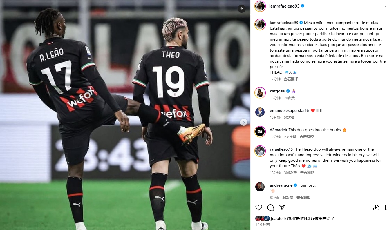 萊奧發(fā)文:“我的兄弟,我共歷風(fēng)雨的伙伴,我們一起度過(guò)了無(wú)數美好與艱難的時(shí)刻。能與你共享更衣室和球場(chǎng),是我的榮幸。在這新的旅程中,我衷心祝愿你一切順利。我會(huì )非常想念你,因為這些年你已成為我生命中重要的人。本不該以這種方式告別,但人生充滿(mǎn)挑戰。愿你在新的征程中好運常伴,而我永遠會(huì )為你、為我們加油!”