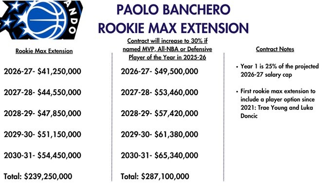 如果班凱羅下賽季解鎖MVP、DPOY和最佳陣容中的任何一項,那么他的合同是5年2.87億,細節如下: