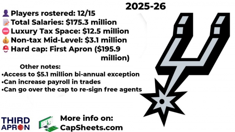 交易完成后,馬刺送走了不在球隊計劃中的布蘭納姆、韋斯利,換來(lái)了能打的老將奧利尼克。目前他們有12名正式合同球員,總薪資1.75億,距離奢侈稅線(xiàn)還差1250萬(wàn),距離第一硬帽還差2000萬(wàn),中產(chǎn)特例還剩310萬(wàn)(簽科內特已經(jīng)花了1100萬(wàn)),還有一個(gè)510萬(wàn)的雙年特例可用,再就是底薪可以提供。