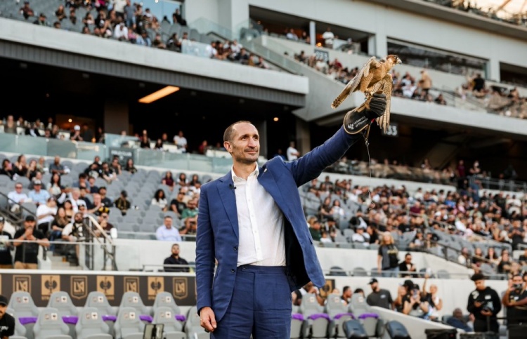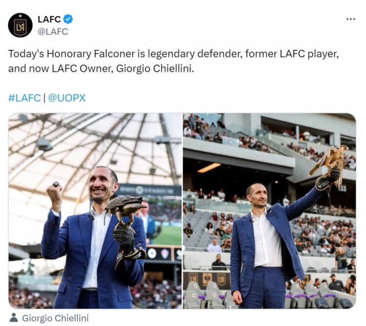 洛杉磯FC配文:“今天的榮譽(yù)馴鷹師是傳奇后衛、前洛杉磯FC球員、如今的洛杉磯FC股東——基耶利尼?!?/p>