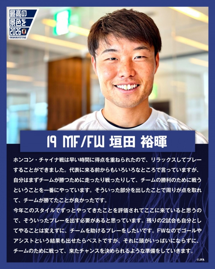 垣田裕暉表示:“與中國香港隊的比賽我們早早取得了進(jìn)球,進(jìn)球后球隊也能夠以放松的心態(tài)進(jìn)行比賽。在來(lái)到國家隊前自己也談到了一些內容,但首先還是要為了取勝在場(chǎng)上全力奔跑、與對手全力周旋,畢竟球隊的勝利是最重要的。通過(guò)自己的表現能夠幫助周?chē)年犛讶〉眠M(jìn)球,進(jìn)而幫助球隊取勝,這是很好的?!?/span>