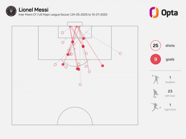 梅西在這5場(chǎng)比賽中,25次射門(mén),其中頭球1次,左腳23次,右腳1次,打進(jìn)9球。