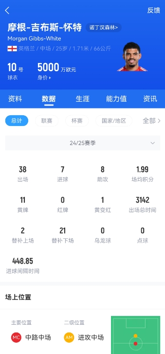 吉布斯-懷特現年25歲,英格蘭中場(chǎng),本賽季在諾丁漢森林大放異彩,貢獻7球8助,德轉身價(jià)為5000萬(wàn)歐。