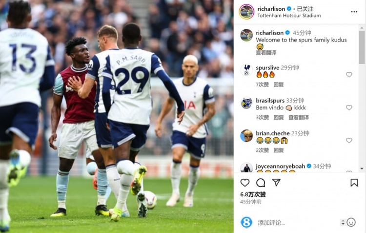 熱刺前鋒理查利森更新社媒動(dòng)態(tài),曬出庫杜斯與熱刺球員在球場(chǎng)上發(fā)生沖突的照片,配文:“歡迎加入熱刺大家庭,庫杜斯??”