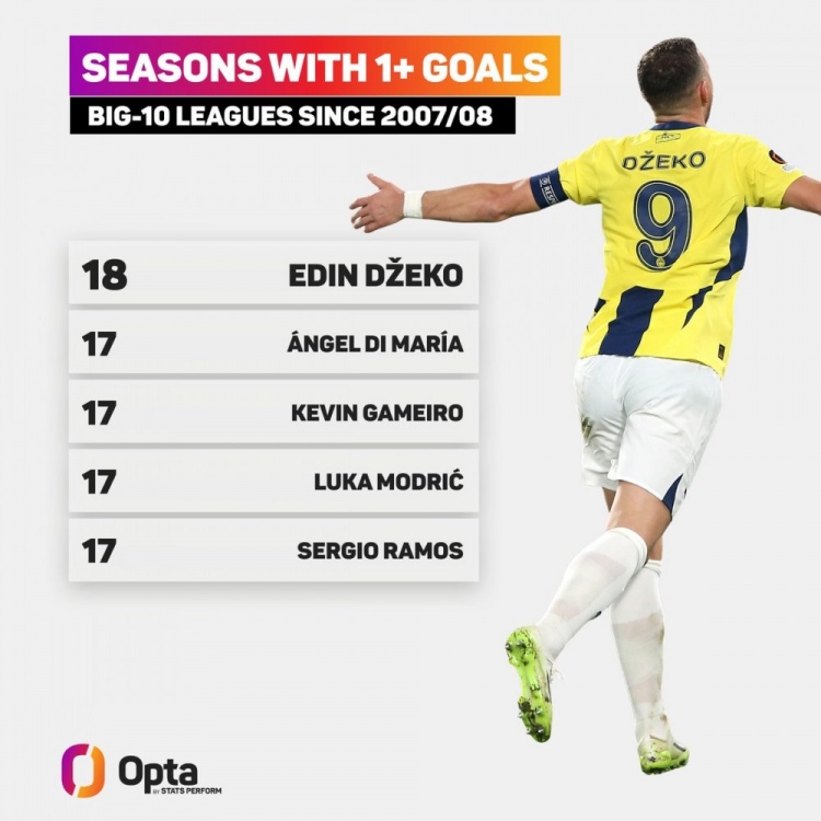 數據統計顯示,哲科是唯一一位在過(guò)去18個(gè)賽季(自2007-08賽季德甲首秀以來(lái))均在歐洲前十聯(lián)賽能夠取得進(jìn)球的球員。期間在這些賽事中共計進(jìn)球258個(gè)。
