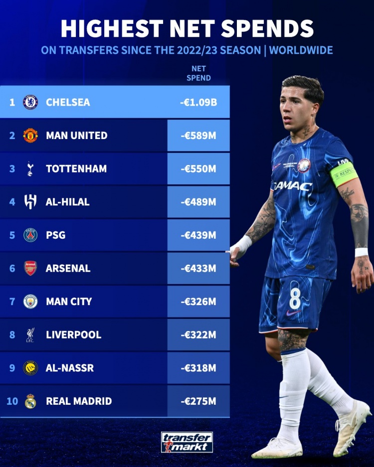 7月11日訊 自2022年伯利入主切爾西以來(lái),在轉會(huì )市場(chǎng)瘋狂地招兵買(mǎi)馬,目前的凈支出已超過(guò) 10 億歐元。德轉統計了2022/23賽季至今全球足壇轉會(huì )凈支出榜單,切爾西以10.9億歐領(lǐng)跑全球。