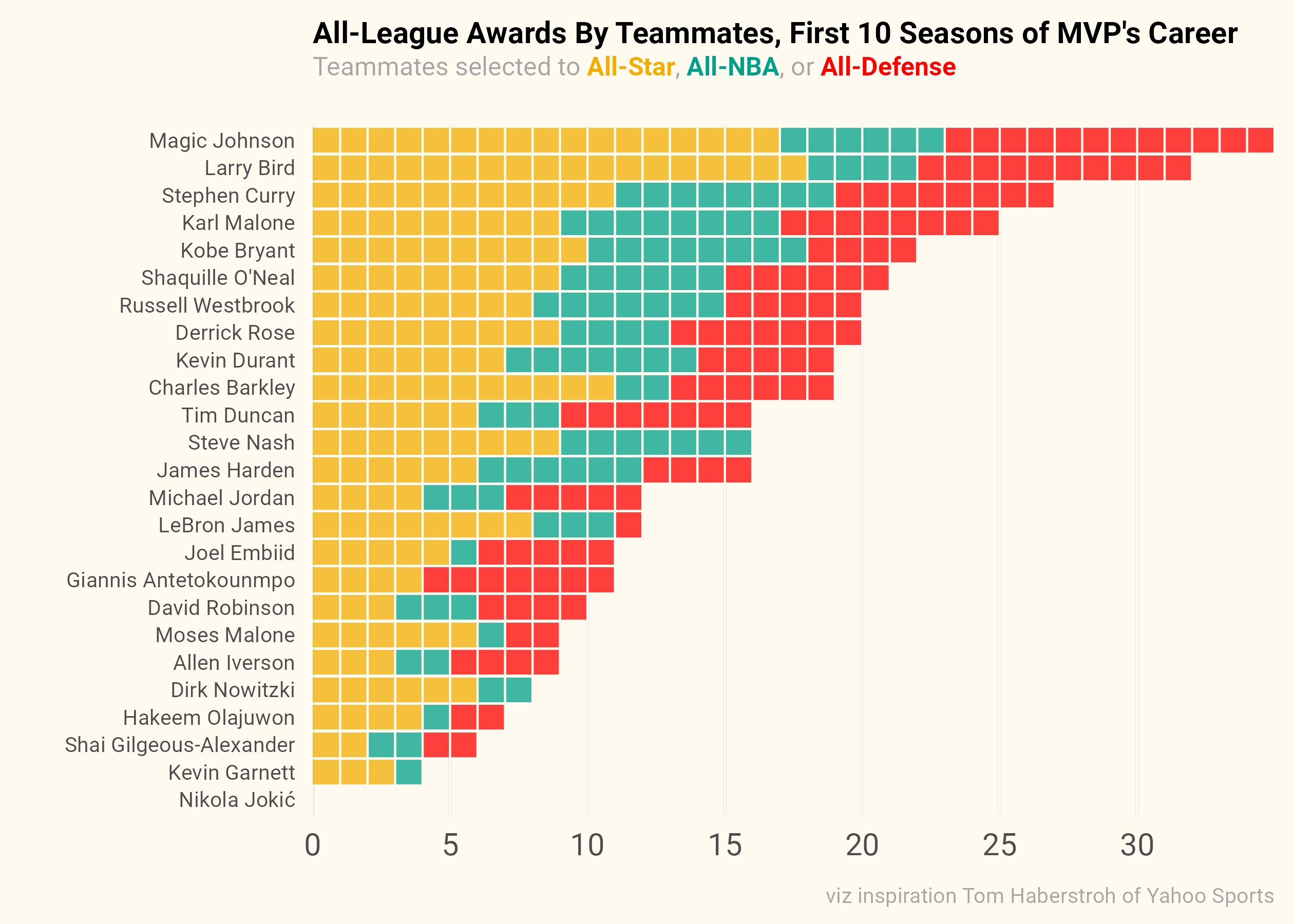 以下為部分MVP球員職業(yè)生涯前10個(gè)賽季中隊友入選聯(lián)盟最佳獎項統計: