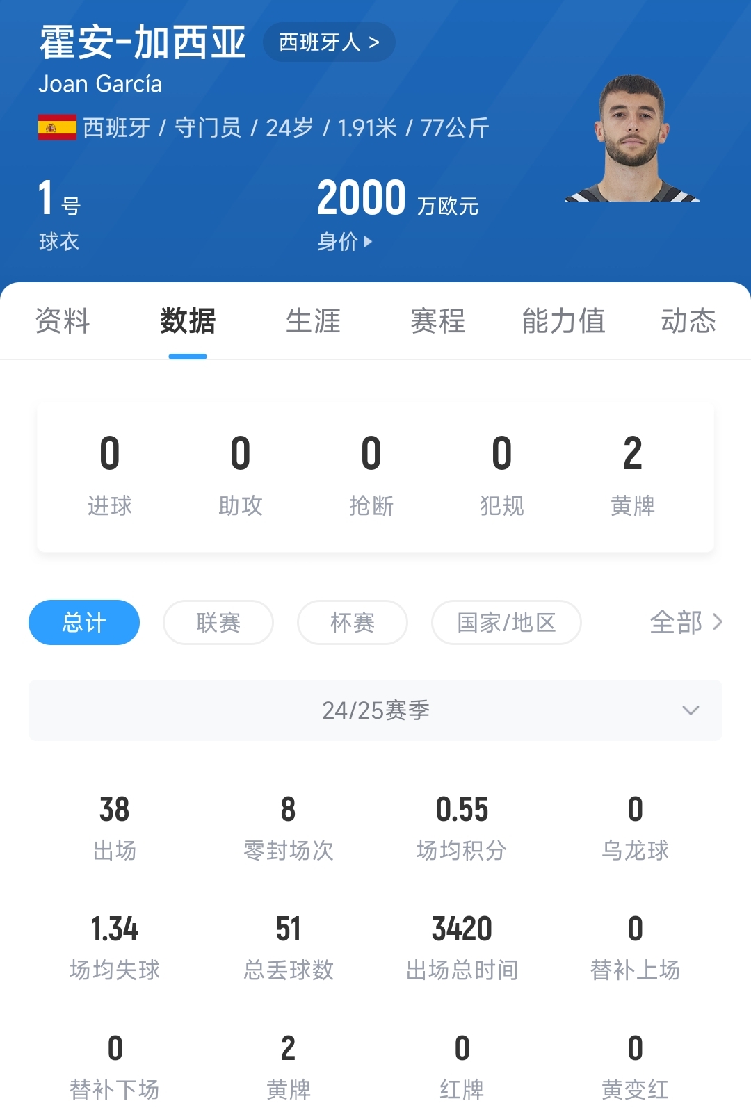 24歲的霍安-加西亞本賽季代表西班牙人出戰38場(chǎng)比賽,丟掉51球,完成8次零封。