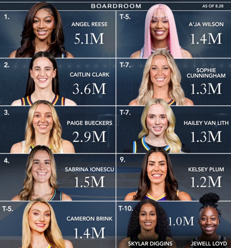 9月15日訊 WNBA本賽季常規賽已經(jīng)結束,美媒boardroom統計了WNBA球星的社媒粉絲數排行。