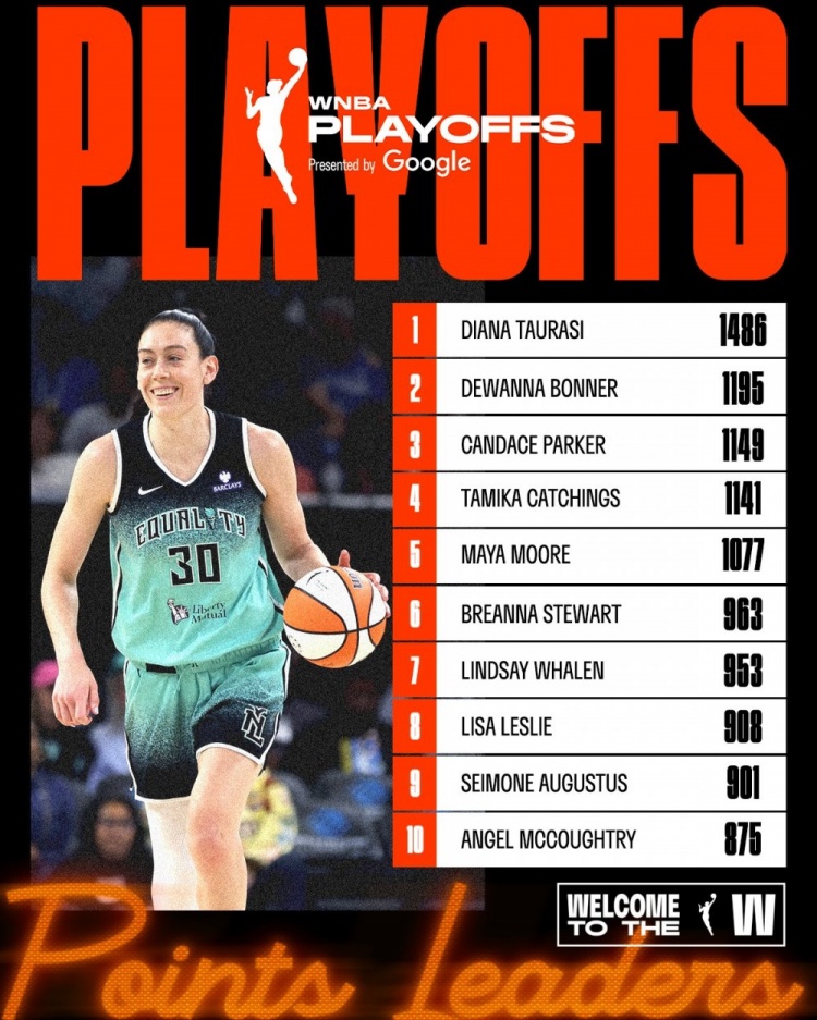 在比賽的上半場(chǎng),斯圖爾特超越了林賽-惠倫,以963分升至 WNBA 季后賽歷史得分榜第6位 。
