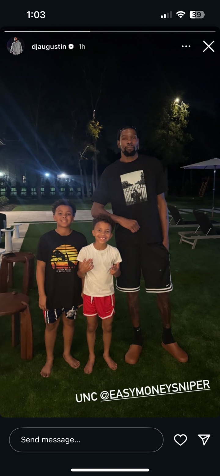 09月15日訊 現火箭隊球探、前火箭球員DJ-奧古斯汀今日更新Instagram,曬出了自己倆兒子和杜蘭特的合影,并寫(xiě)道:“杜叔叔@杜蘭特?!?/p>