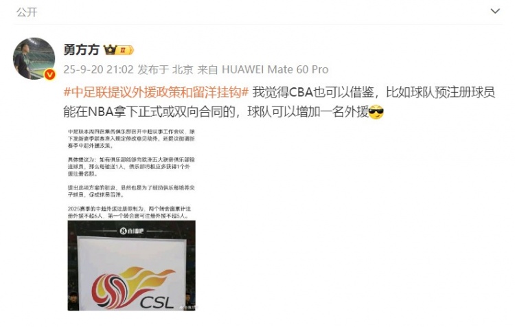 9月20日訊 今天,北京男籃記者@勇方方 在社媒上談到了中足聯(lián)提議外援政策和留洋掛鉤一事。