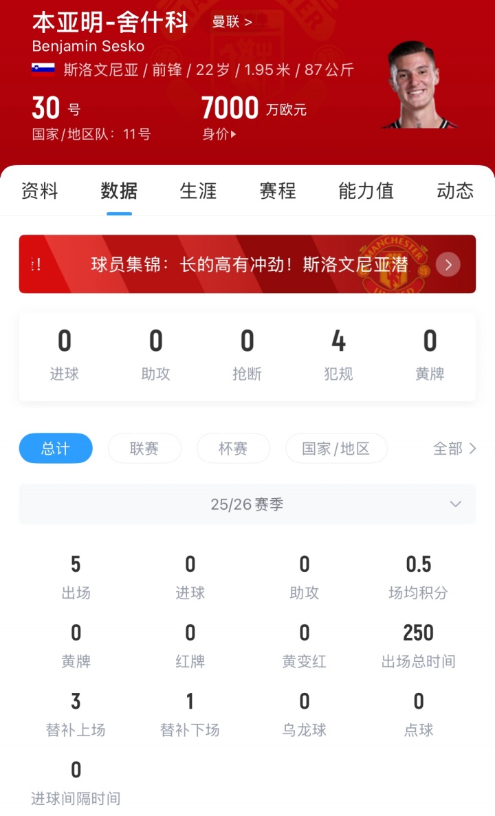 加盟曼聯(lián)至今,舍什科各賽事已為曼聯(lián)出戰5場(chǎng)(2次首發(fā)),共踢了250分鐘,仍是0球0助。