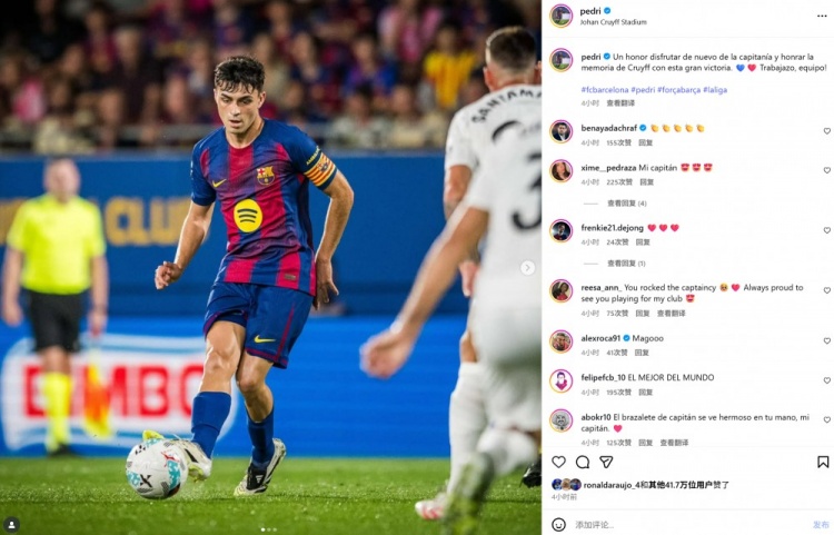 本場(chǎng)比賽佩德里首發(fā)出戰并佩戴隊長(cháng)袖標,賽后他在社媒曬照紀念寫(xiě)道:“再次戴上隊長(cháng)袖標是一份榮耀,也用一場(chǎng)漂亮的勝利在克魯伊夫球場(chǎng)留下美好回憶。全隊都做得不錯!”