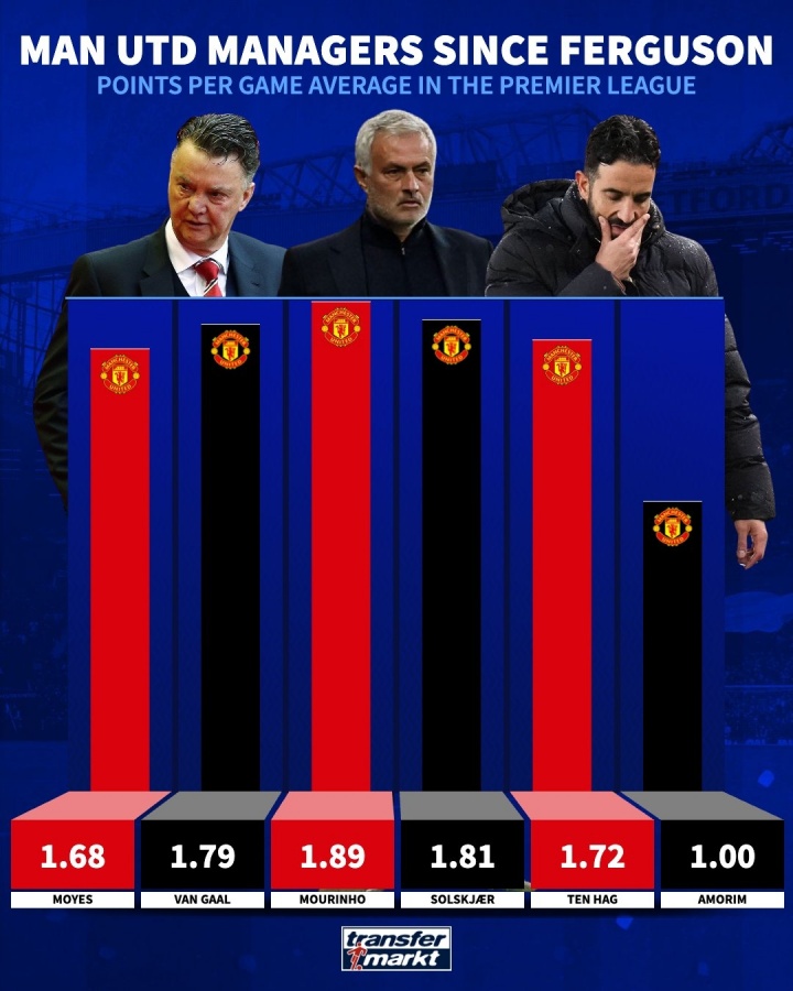 德轉統計了在弗格森爵士離任后,曼聯(lián)幾任主教練每場(chǎng)英超比賽平均獲得的積分情況,其中穆里尼奧場(chǎng)均1.89分最高,阿莫林則場(chǎng)均1分遠落后于幾位前任主帥。