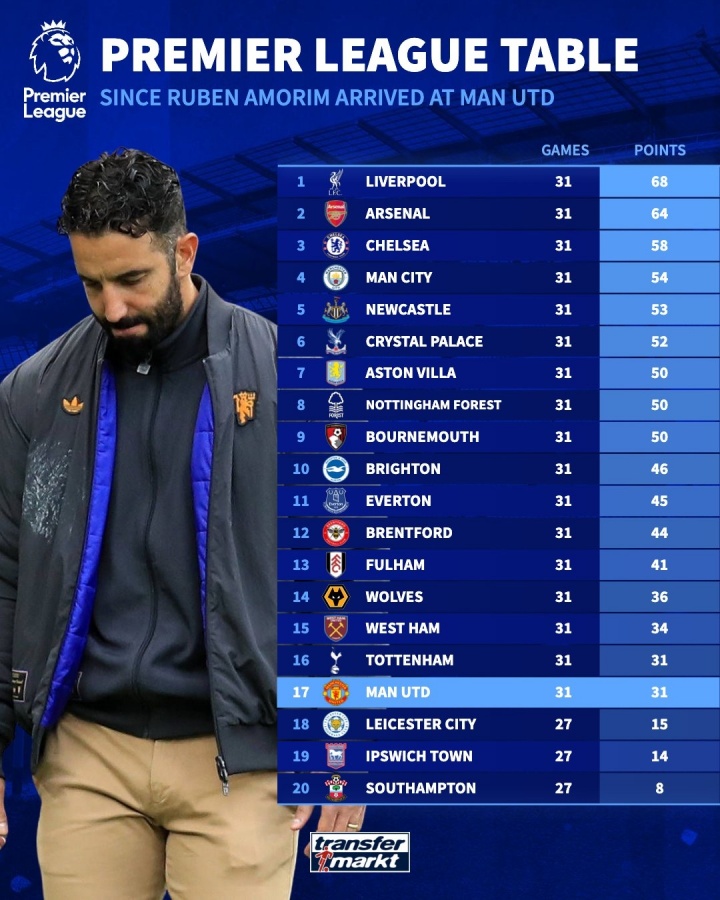 此外,阿莫林上任后帶領(lǐng)曼聯(lián)在31輪英超中僅獲得31分,除去涉及升降級的球隊(因場(chǎng)次數量不同)同期英超排名墊底,甚至不及利物浦、阿森納積分的一半。