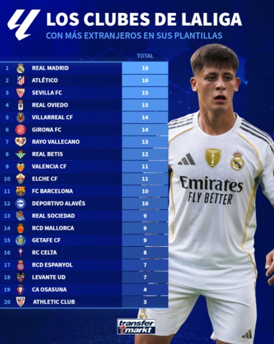 9月16日訊 近年來(lái),皇馬引進(jìn)了多名外籍球員,這讓球隊中外籍球員比例不斷上升。根據德國轉會(huì )市場(chǎng)的統計,皇馬陣中目前有18名外籍球員,占比高達72%(18/25),是西甲中外籍球員最多的俱樂(lè )部。