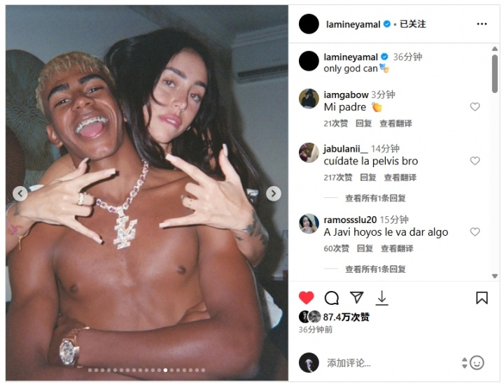 亞馬爾脖子上佩戴的鑲鉆項鏈為其18歲生日時(shí)多米尼加歌手阿爾法所贈,據悉價(jià)值40萬(wàn)歐元。