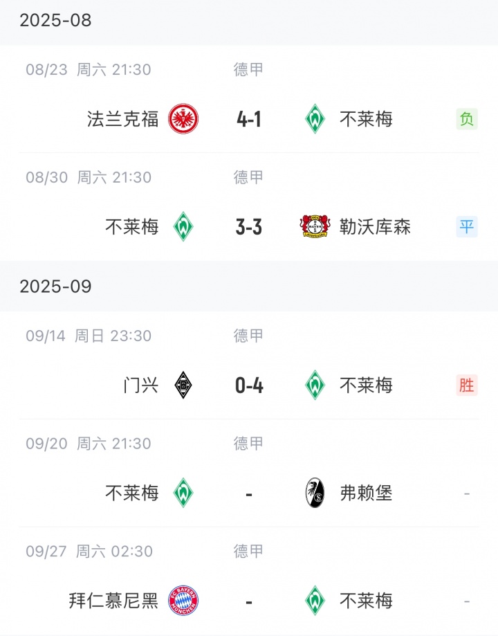 不萊梅德甲前三輪1勝1平1負,目前積4分位列德甲第9。