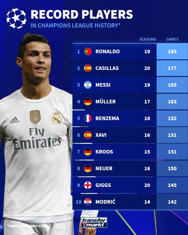 09月16日訊 今夜,新賽季歐冠就將打響。德轉在賽前列出了歐冠歷史出場(chǎng)榜,C羅以183場(chǎng)位列榜首,卡西、梅西分列二三。