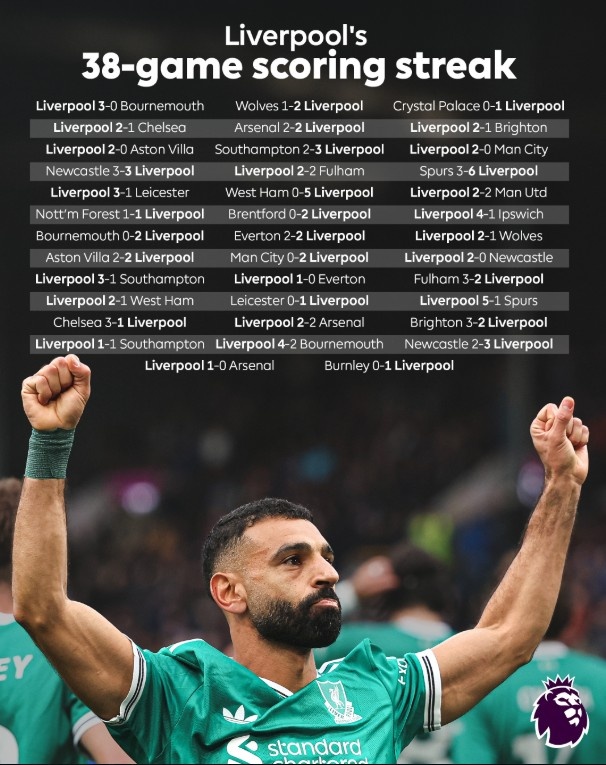 9月16日訊 根據英超官方統計,利物浦連續38場(chǎng)聯(lián)賽取得進(jìn)球。