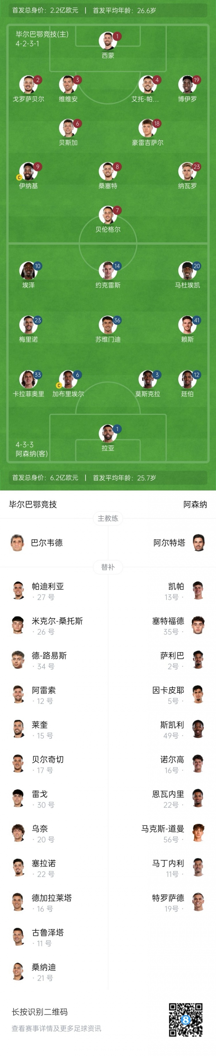 09月16日訊 歐冠聯(lián)賽階段第1輪,畢爾巴鄂競技主場(chǎng)迎戰阿森納,賽前首發(fā)名單公布。本場(chǎng)比賽厄德高、薩卡、哈弗茨、本-懷特因傷缺戰,新援約克雷斯、埃澤、馬杜埃凱出戰,薩利巴回歸坐鎮替補。