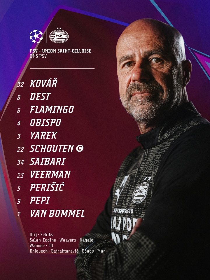 埃因霍溫首發(fā):32-科瓦爾、8-德斯特、6-弗拉明戈、4-奧比斯波、3-亞雷克、22-斯豪滕、34-塞巴里、23-威爾曼、5-佩里西奇、9-佩皮、7-范博梅爾