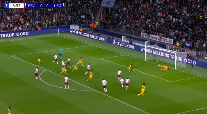 比賽第9分鐘,埃因霍溫防守球員禁區內解圍時(shí)踢倒對方送點(diǎn),普羅米斯-戴維主罰一蹴而就!