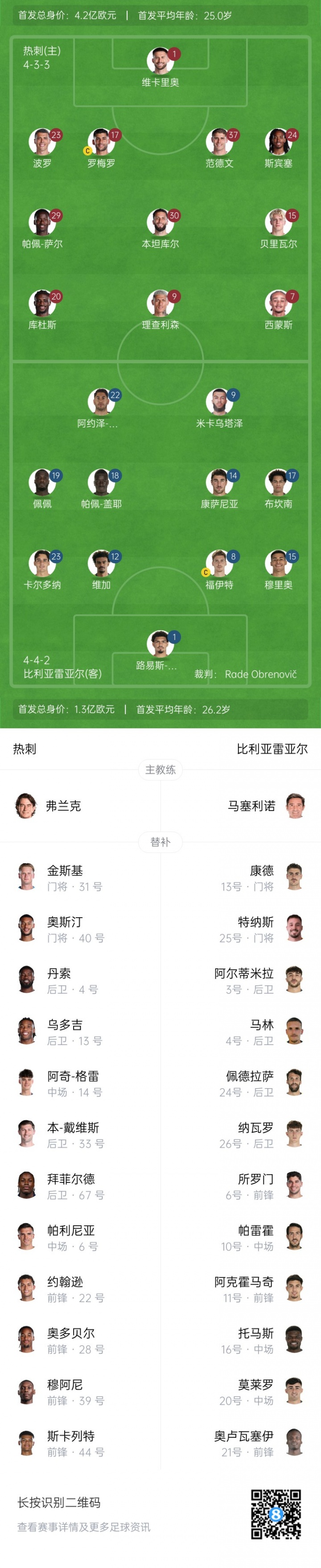 熱刺方面,新援哈維-西蒙斯首發(fā)與理查利森、庫杜斯搭檔鋒線(xiàn),穆阿尼則替補待命。黃潛方面,新援維加、米卡烏塔澤先發(fā),前槍手中場(chǎng)托馬斯替補。