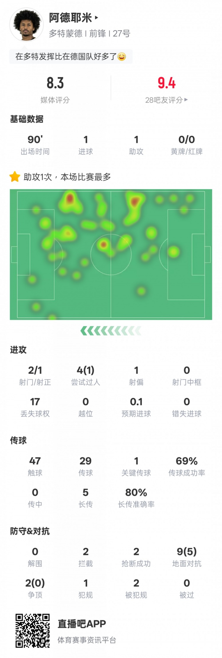 9月17日訊 歐冠聯(lián)賽階段第1輪,多特4-4尤文。阿德耶米首發(fā)出戰,傳射建功,還有1次過(guò)人成功和1次關(guān)鍵傳球,評分8.3。