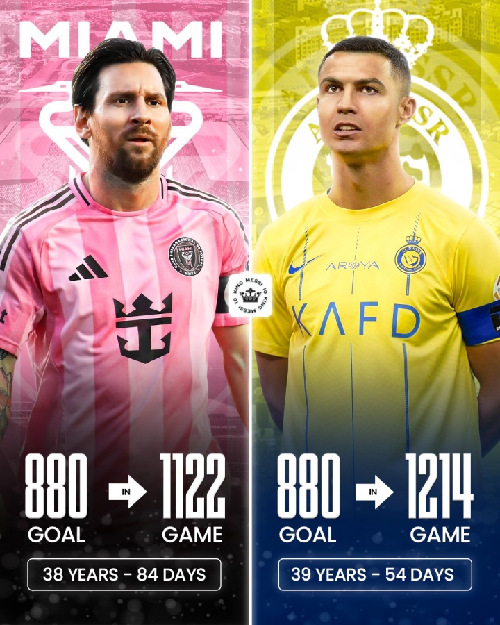 據統計,梅西在38歲84天達成880球,所用場(chǎng)次1122場(chǎng);此前C羅在39歲54天達成880球,所用場(chǎng)次1214場(chǎng)。