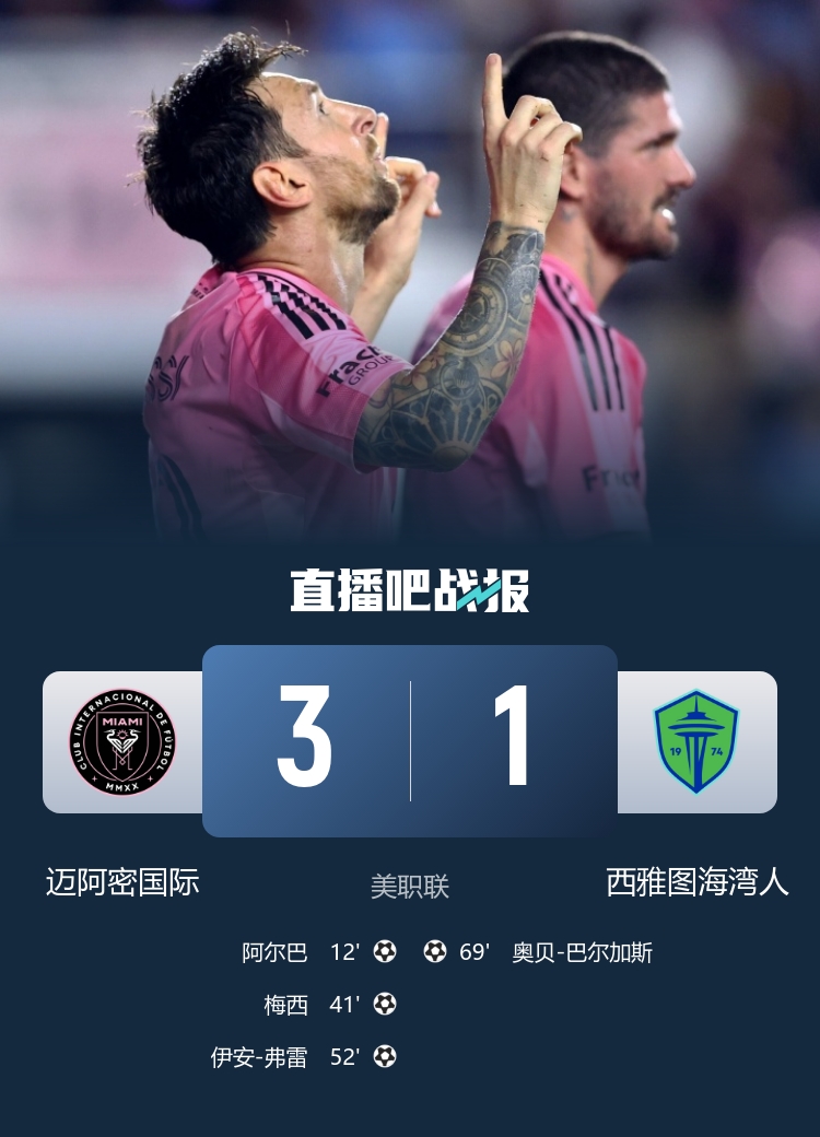 9月17日訊 北京時(shí)間9月17日上午7:30,美職聯(lián)邁阿密?chē)H坐鎮洛克哈特體育場(chǎng)對陣西雅圖海灣人。上半場(chǎng),梅西助攻阿爾巴破門(mén),梅西失單刀,阿爾巴投桃報李助梅西破門(mén)。下半場(chǎng),德保羅助攻弗雷進(jìn)球,巴爾加斯扳回一城。全場(chǎng)結束,邁阿密?chē)H3-1西雅圖海灣人。本場(chǎng)過(guò)后,邁阿密?chē)H14勝7平6負積49分升至東部第5,西雅圖海灣人12勝9平8負積45分暫列西部第4。